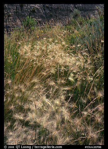 Barley grasses with badlands in background, North Unit. Theodore Roosevelt National Park, North Dakota, USA.