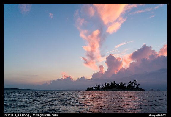 Islet and clouds at sunset, Rainy Lake. Voyageurs National Park, Minnesota, USA.