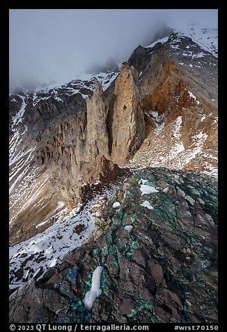 Copper deposits, and pinnacles below Bonanza Peak. Wrangell-St Elias National Park, Alaska, USA.