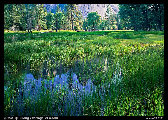 Flooded Meadow below Cathedral Rock in spring. Yosemite National Park, California, USA.