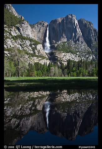 Yosemite Falls and meadow reflected in run-off pond, morning. Yosemite National Park (color)