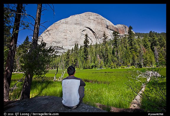 Hiker looking at backside of Half-Dome from Lost Lake. Yosemite National Park (color)