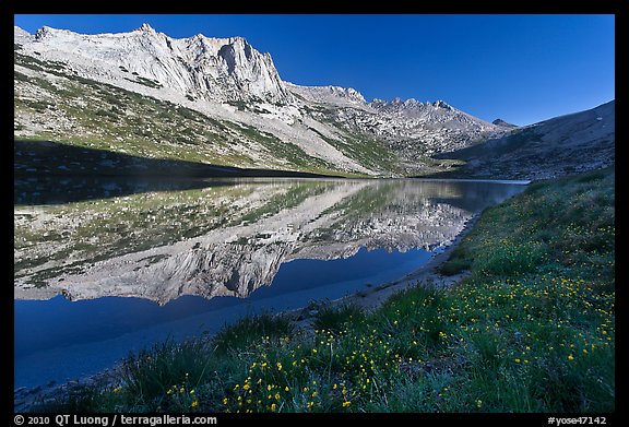 Flowers, Sheep Peak reflected in Roosevelt Lake. Yosemite National Park, California, USA.