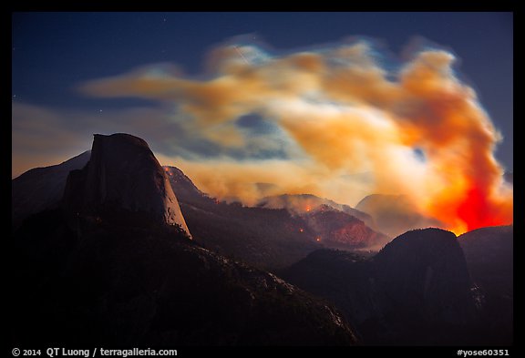Half-Dome, fire and smoke at night. Yosemite National Park (color)