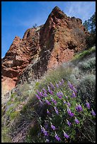 The remains of an ancient volcano consisting of massive monoliths, spires, red crags, and talus cave, rise out of the meditteranean chaparral-covered Gabilan Mountains, a sanctuary for the California condor.