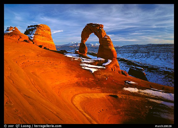 Location: US National Parks / Plateau / Arches Subjects: Deserts, Distant Ranges, Geology, Mountains, Natural Arches, Nobody, Outside, Rock Formations, Sandstone, Scenics with Sky, Swirls, Wild Scenics, Wilderness