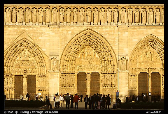 People standing in front of gates of Notre Dame Cathedral, late afternoon. Paris, France