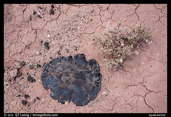 Ground view with buried section of black petrified wood. Petrified Forest National Park, Arizona, USA.