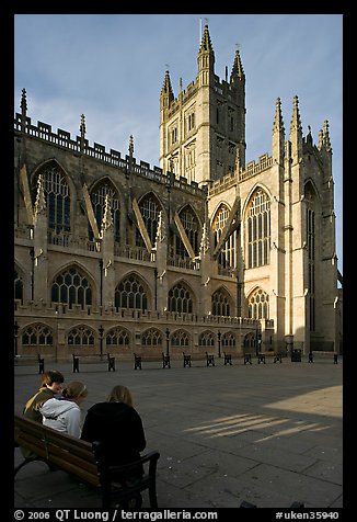 Young people sitting on a bench in a square below Bath Abbey. Bath, Somerset, England, United Kingdom