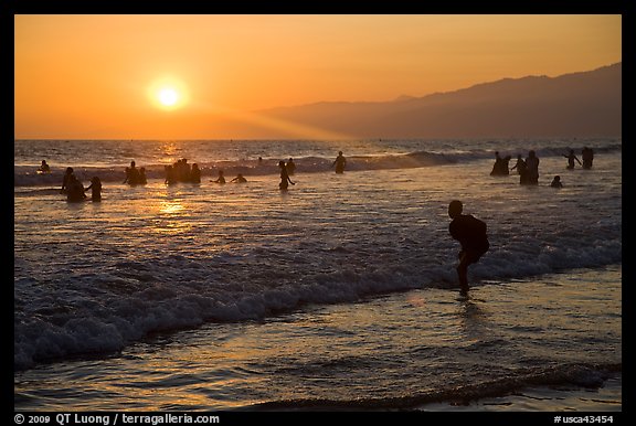 Sunset on beach shore, Santa Monica Beach. Santa Monica, Los Angeles, California, USA