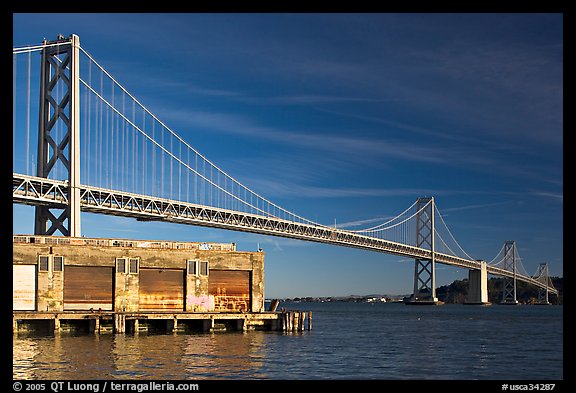 Old pier and Bay Bridge, early morning. San Francisco, California, USA