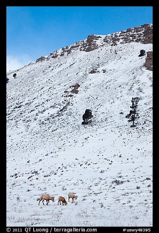 Bighorn sheep family on snowy slope. Jackson, Wyoming, USA