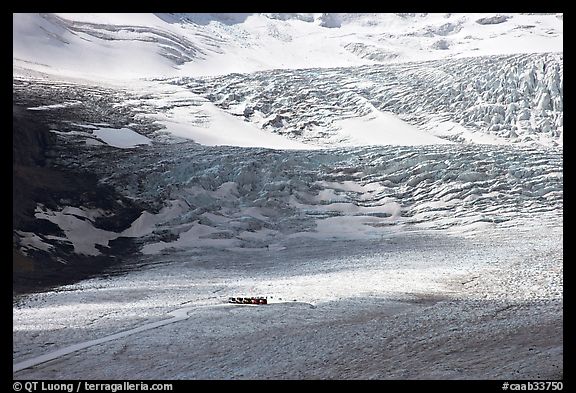 Distant view of snowcoaches parked at the base of the lower icefall on the Athabasca Glacier. Jasper National Park, Canadian Rockies, Alberta, Canada