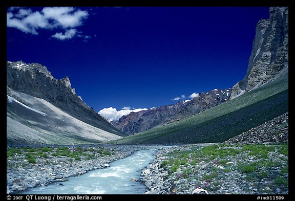Zanskar River flanked by high cliff, Zanskar, Jammu and Kashmir. India