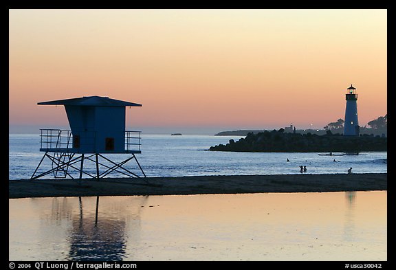 Beach cabin and lighthouse, Twin Lakes State Beach, sunset. Santa Cruz, California, USA