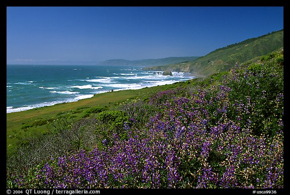 Purple wildflowers and Ocean near Fort Bragg. California, USA
