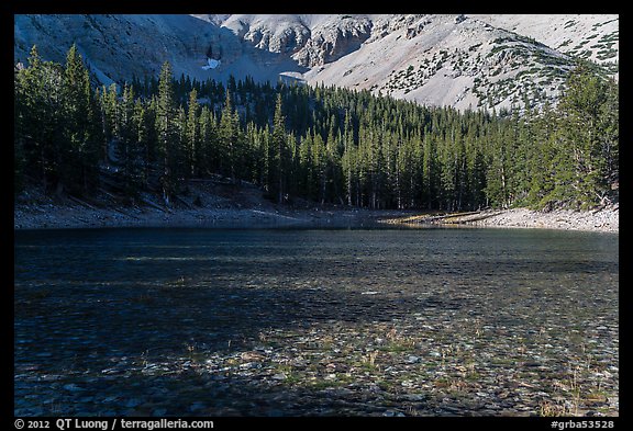 Shadows and conifer forest, Teresa Lake. Great Basin National Park, Nevada, USA.