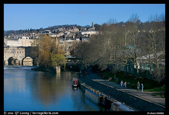 Pulteney Bridge, Avon River, Houseboats, and quay. Bath, Somerset, England, United Kingdom