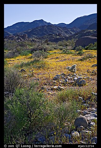 Coreopsis and cactus, and Queen Mountains near the North Entrance, afternoon. Joshua Tree National Park, California, USA.