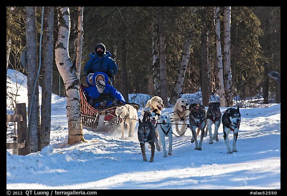 Musher and passengers pulled by dog team. Chena Hot Springs, Alaska, USA