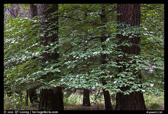 Dogwood tree between two dark pine tree trunks. Yosemite National Park, California, USA.