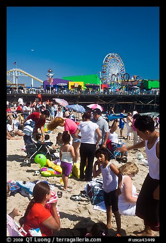Families on beach and Pacific Park on Santa Monica Pier. Santa Monica, Los Angeles, California, USA