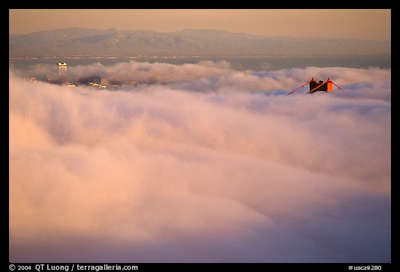 Pilar of the Golden Gate Bridge emerging from the fog at sunset. San Francisco, California, USA