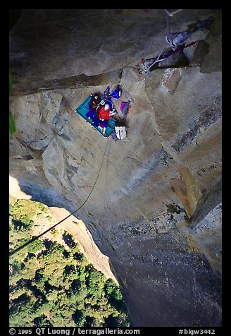 Belaying the steepest (most horizontal) part of the route. Leaning Tower, Yosemite, California