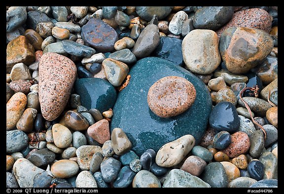 Colorful pebbles shining in the rain. Acadia National Park, Maine, USA.