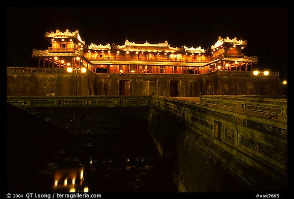 Ngo Mon (noon) Gate illuminated at night. Hue, Vietnam