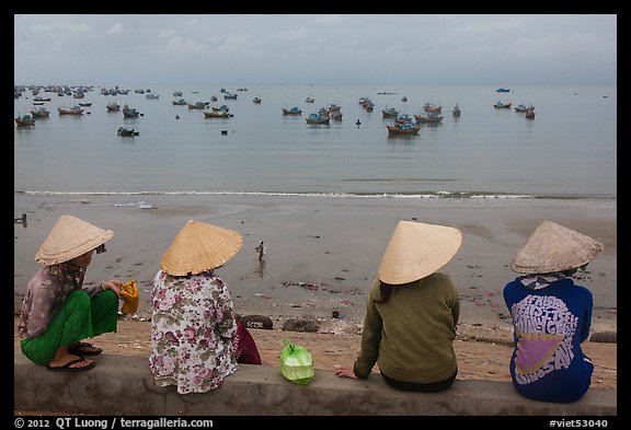 Four women in conical hats watch fishing activity from high above fishing village. Mui Ne, Vietnam
