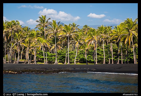 Black sand beach and palm trees, Punaluu. Big Island, Hawaii, USA