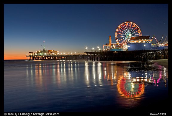 Pier, Ferris Wheel, and reflections at dusk. Santa Monica, Los Angeles, California, USA