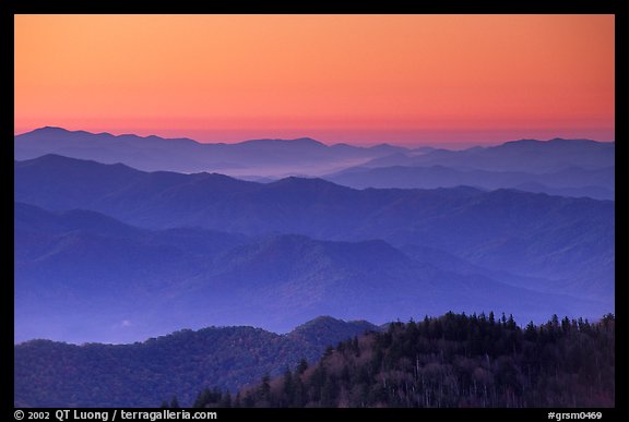 Blue ridges and orange dawn glow from Clingman's dome, North Carolina. Great Smoky Mountains National Park, USA.