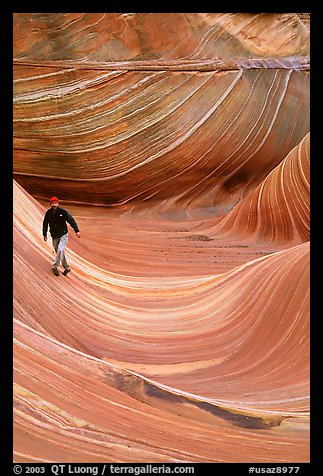Hiker balances himself in the Wave. Coyote Buttes, Vermilion cliffs National Monument, Arizona, USA
