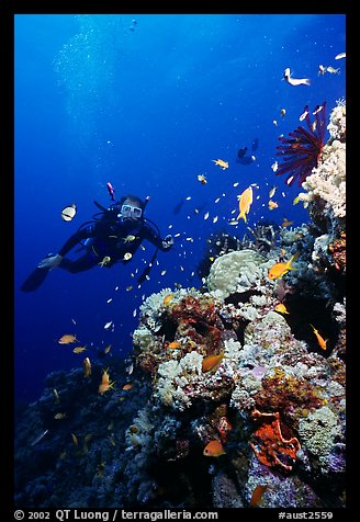 Scuba diver, coral, and fish. The Great Barrier Reef, Queensland, Australia