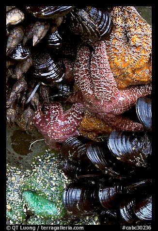 Sea stars and mussels, South Beach. Pacific Rim National Park, Vancouver Island, British Columbia, Canada