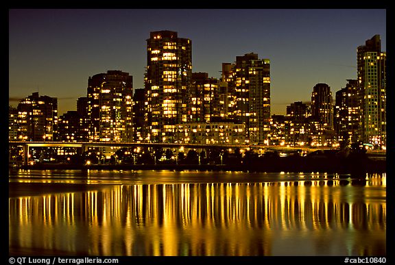 High-rise buildings reflected in False Creek at night. Vancouver, British Columbia, Canada