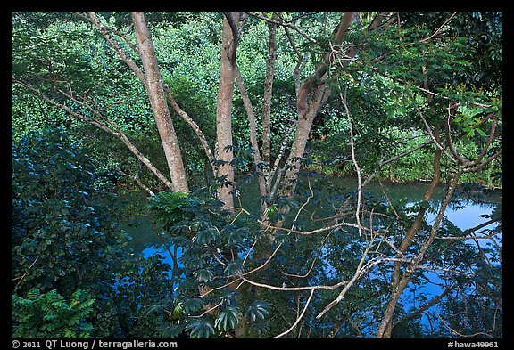 Tropical forest and stream reflecting sky. Kauai island, Hawaii, USA