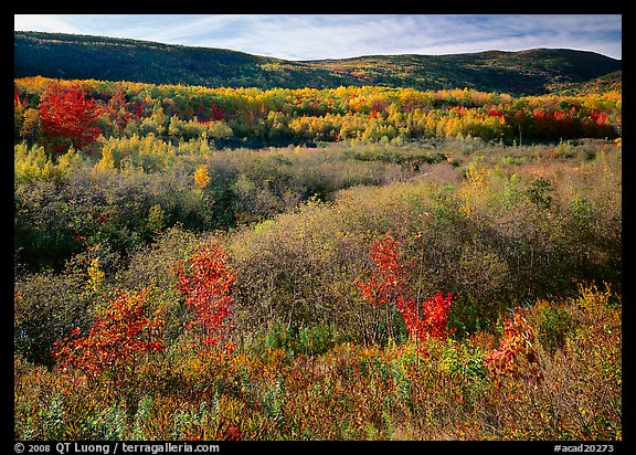 Shrubs, and hills with trees in autumn colors. Acadia National Park, Maine, USA.