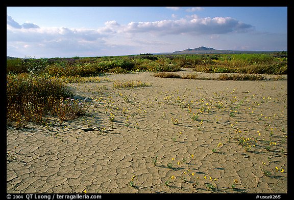 Wildflowers growing out of cracked mud flats. Antelope Valley, California, USA