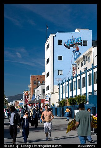 Jogger in the crowd of Ocean Front Walk, with a Venice Mural behind. Venice, Los Angeles, California, USA