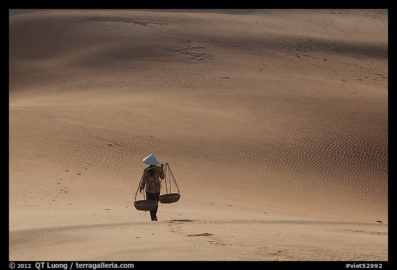 Woman walking on dune field with yoke baskets. Mui Ne, Vietnam