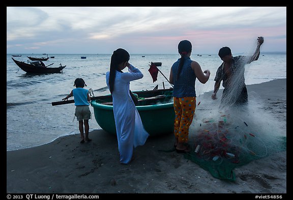 Fishermen folding net out of coracle boat as children watch. Mui Ne, Vietnam