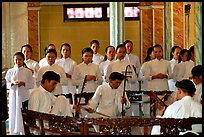 Tay Ninh is the holy site of Caodaism, probably Vietnam's most curious indigenous religion. Caodaism, founded in 1926 by Ngo Minh Chieu, is an attempt at an ideal religion, using religious and philosophical traditions from the West and the East, including Buddhism, Confusianism, Taoism, Hinduism, native Vietnamese spiritism, Christianity and Islam. The eclectism of the religion is reflected in the Great Temple in Tay Ninh. Built between 1933 and 1955, it combines architectural elements of a church, a pagoda in an extravagant rocco style. The ceremony at the Great Cao Dai temple has a visually beautiful ritual, with the ordinary clergy in white robes and only the high priests wearing color. Traditional music is sung and played as well. The ceremony takes place four times a day, noon beeing the most convenient for visitors, who are admitted on upstairs balconies.